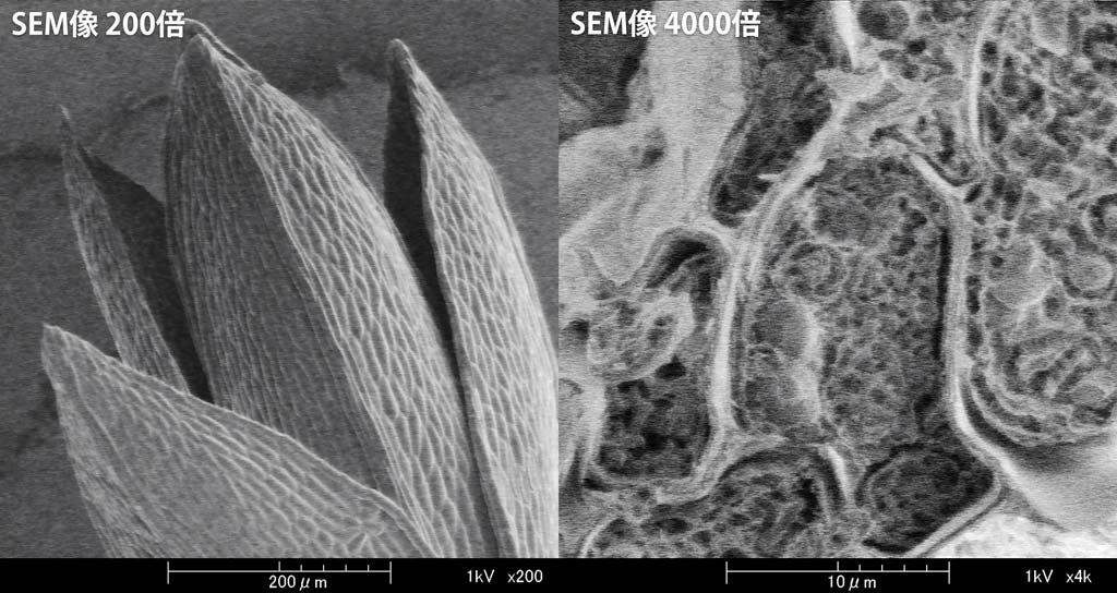 コケの葉は、ほとんどの場合、細胞が一層で構成されているため乾燥しやすく、常温でSEM観察すると短時間のうちに葉の形が変わってしまいます。トライ顕微鏡では、凍結することで試料の変形を防ぎながら観察することが可能です。