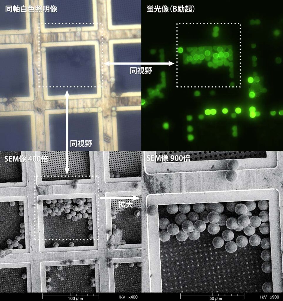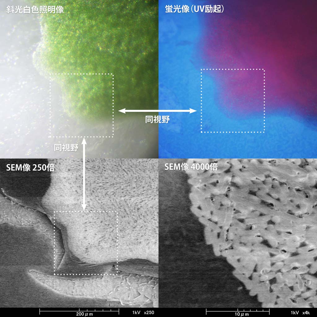光学顕微鏡だけでも、照明の波長、照射方法によって、同じ試料範囲からまったく異なる情報を得ることができます。SEMと組み合わせることによって、さらに、表面の微細な凹凸など別の視点からの情報を得ることが可能になります。