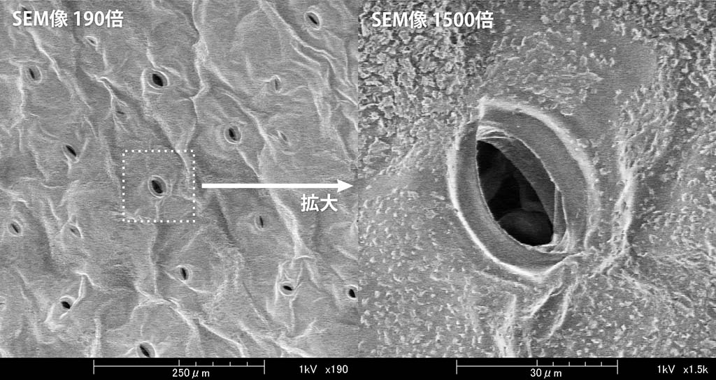葉を切り取り、アルミ試料台にカーボンテープで貼り付け、試料室内で凍結してから、SEM観察しました。気孔を開けて、呼吸している時に、凍結固定されたためと推測しています。