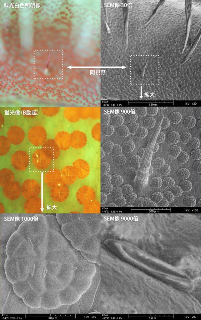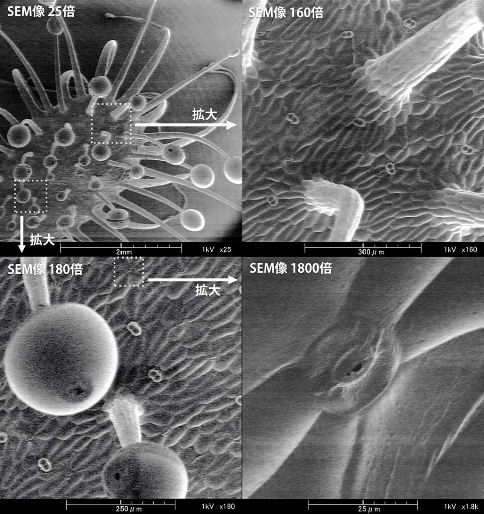 獲物をとらえるための捕虫葉の内側を観察しています。トライ顕微鏡は試料を凍結し無蒸着で観察できるので、光学鏡筒と電子鏡筒を何度も切り替えながら観察を行うことが可能です。複数の光源による観察方法に、手軽に行えるSEM観察を加えることで、従来とはちがう視点で対象物に迫ることができます。