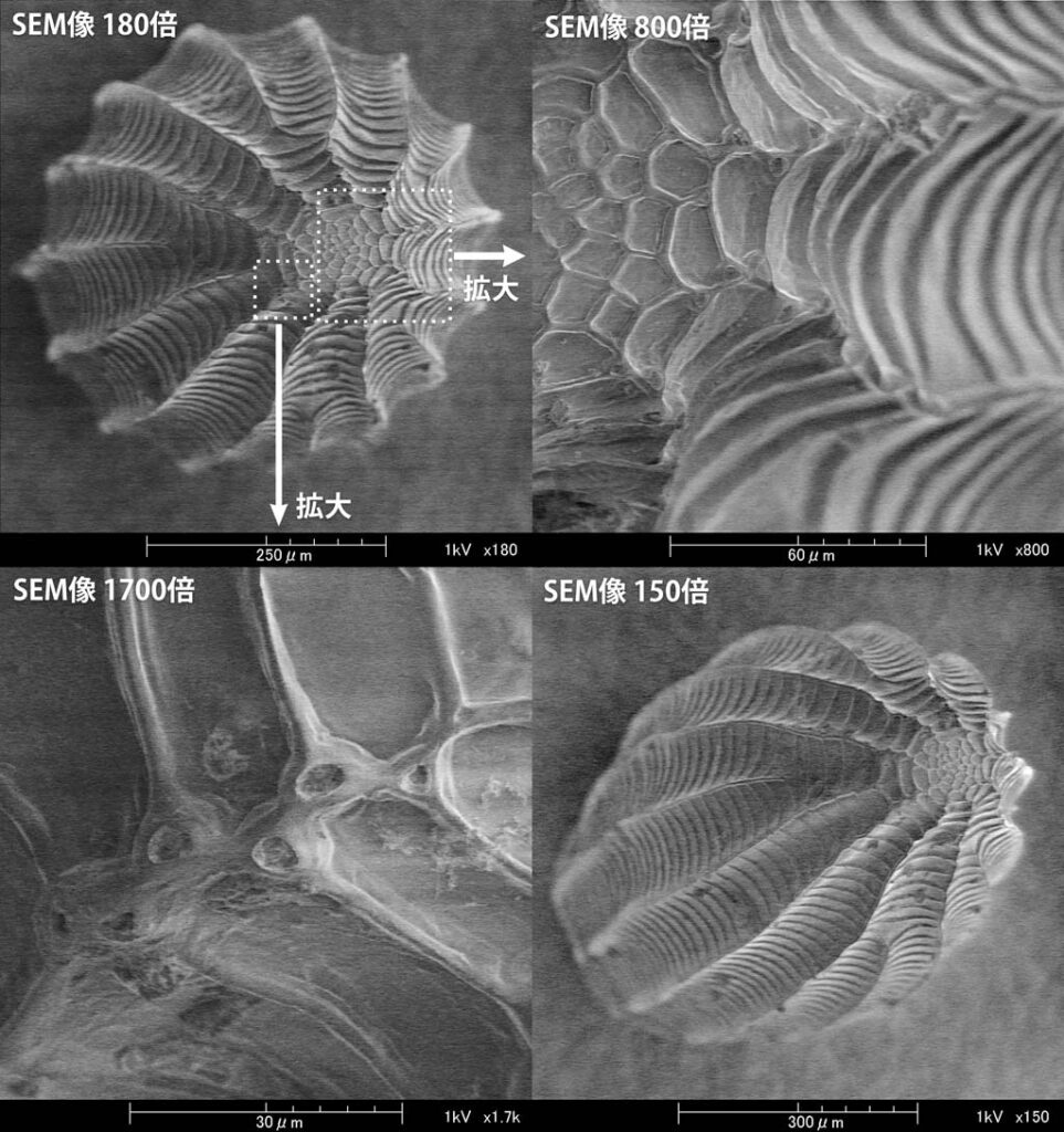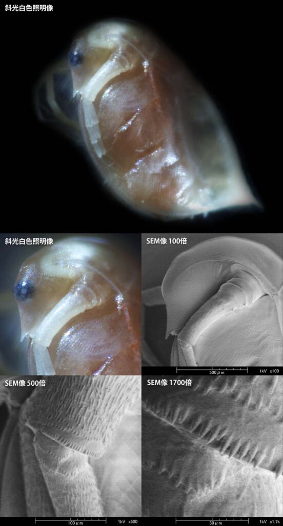 アルミ試料台に載せただけで撮影しています。ミジンコは、光透過性のあるキチン質の固い殻で覆われています。光学顕微鏡では見える眼が、SEMではまったく見えません。実は、ミジンコの眼のように見えるところは複数の個眼が集まった複眼で、殻の内部にあります。そのため、SEMでは内部にある複眼がまったく見えないのです。SEMでは光学顕微鏡では捉えきれない殻の表にある棘や凹凸などの微細な表面構造はよく見えます。