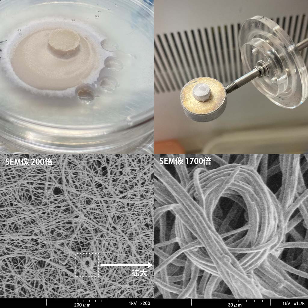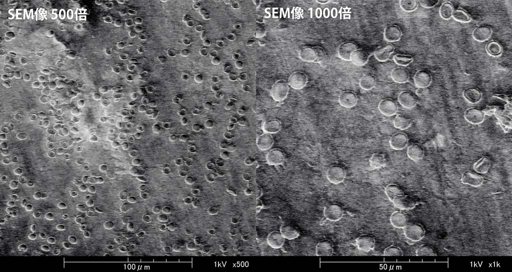 菌糸は非常に細く、乾燥しやすいため従来のSEMでは観察が困難でした。トライ顕微鏡では、切り出した寒天培地を試料台に載せ、試料室内で凍結するだけで、上記のようなSEM観察が可能です。
